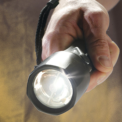 Same features as the StealthLite™ 2400 Flashlight, but with the LED module that produces a true, bright collimated LED beam. The 2410 is corrosion proof, resistant to extreme temperatures, and submersible. It is powered by 4 AA alkaline cells (included). For hands-free operation, attach it to your hard hat with our optional helmet light holder.