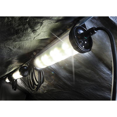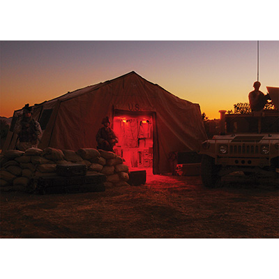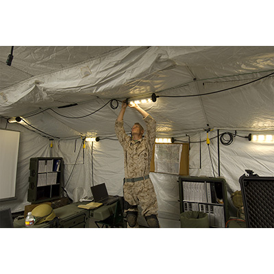 The 9500 Shelter Lighting System provides shelters with safe, secure and silent interior lighting. The 9500 contains three LED light heads equipped with both white and red LEDs allowing for maximum visibility or if needed, preservation of night vision. Each light head produces 2,000 lumens (6,000 total) of white light and 400 lumens of red light (1,200 total). The system is extremely rugged and deploys quickly. It contains three red/white LED light heads, universal transformer, inline switch, fixing straps for easy mounting and a series of color coded industrial grade connecting cables. The light heads are linked together and secured via hanging straps inside the shelter/accommodation. The light color (red or white) is selected via an inline switch and each light head can be independently switched on or off. The lighting system can be powered by a variety of sources including 110-240v AC wall power as well as 12-30v DC options. Unlike conventional glass light tubes, the 9500 light heads are virtually indestructible.
